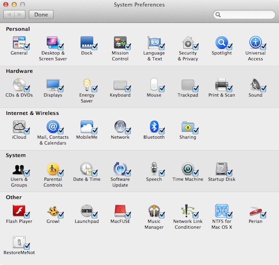 Если у вас есть ненужные элементы, просто уберите галочку на против них. Например, на моем Мас мне не нужны MobileMe и Parental Controls. Когда вы закончите настройку, нажмите кнопку Done в верхней части. Теперь лишние иконки должны исчезнуть.